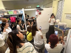 会場は「Maru Maruグルーミングサロン」というトリミングサロンで、「Maru Maruドッググルーミングスクール」という、日本からワーキングホリデーを利用し日本人トリマーの指導を行うスクール事業も展開しており、現地で活躍する多くの日本人トリマーを排出した実績があります。