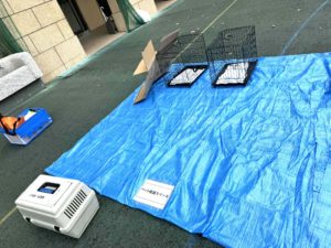明石小学校では拠点運営委員長が訓練に参加し、今後のペット受入れ体制の整備について積極的に検討していく意向を示してくださいました。