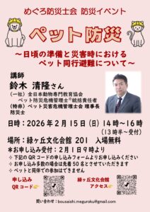 めぐろ防災士会では、『ペット防災』をテーマに、日頃の備えや災害時におけるペット同行避難について学ぶ場として防災イベントが開催されます。